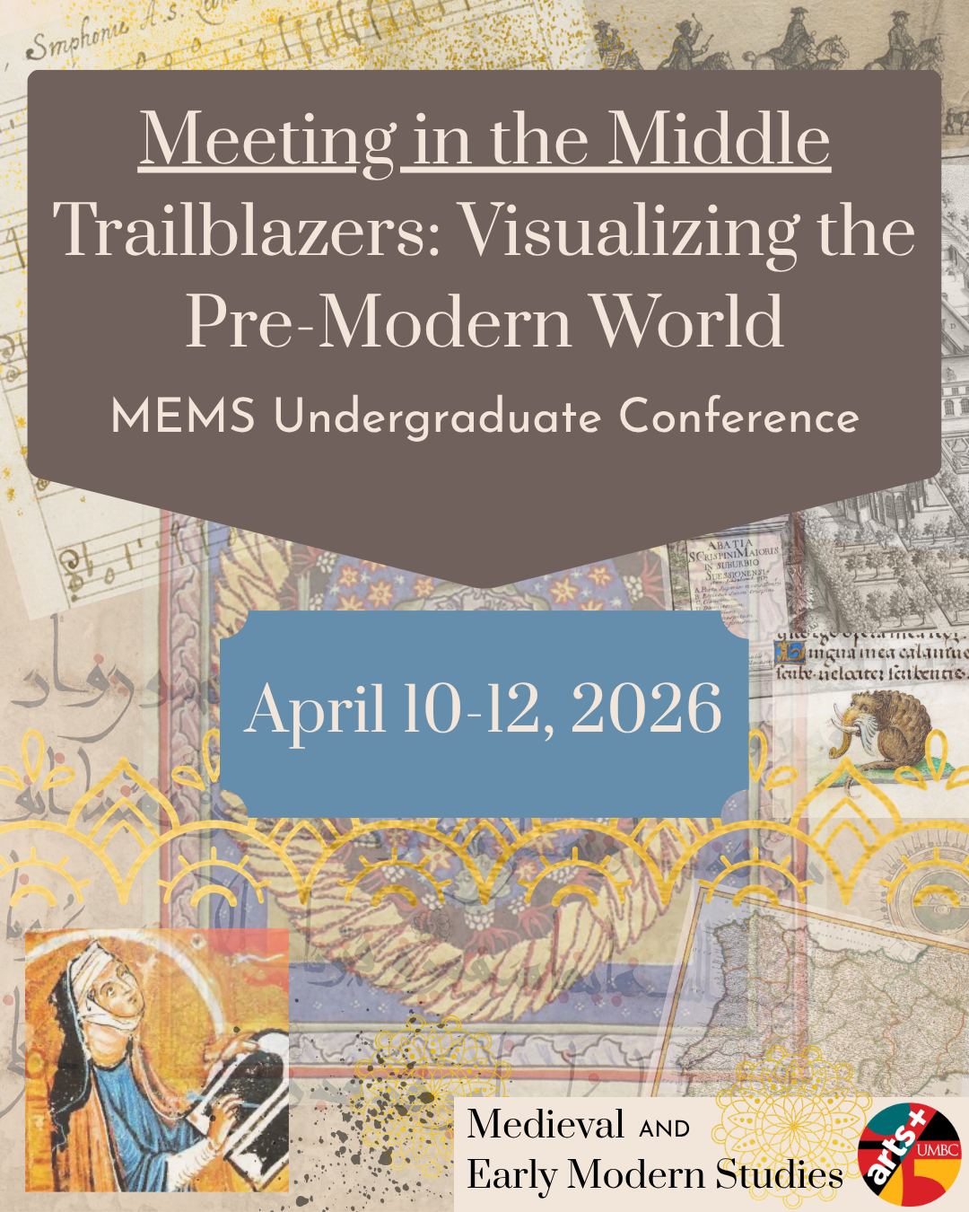 UMBC’s new Undergraduate Conference will bring together students from institutions across the country to share and showcase their research in medieval and early modern topics, with a focus on the visual and performing arts and humanities. This builds on past conferences at Longwood University in Virginia that have been discontinued. Those conferences showcased the diversity and richness of these fields, were well-attended, and widely well-received, and so we again invite students and faculty from the many different disciplines in late antique, medieval, Renaissance, and early modern studies to the literal “middle” Atlantic region, where we will again find common ground.