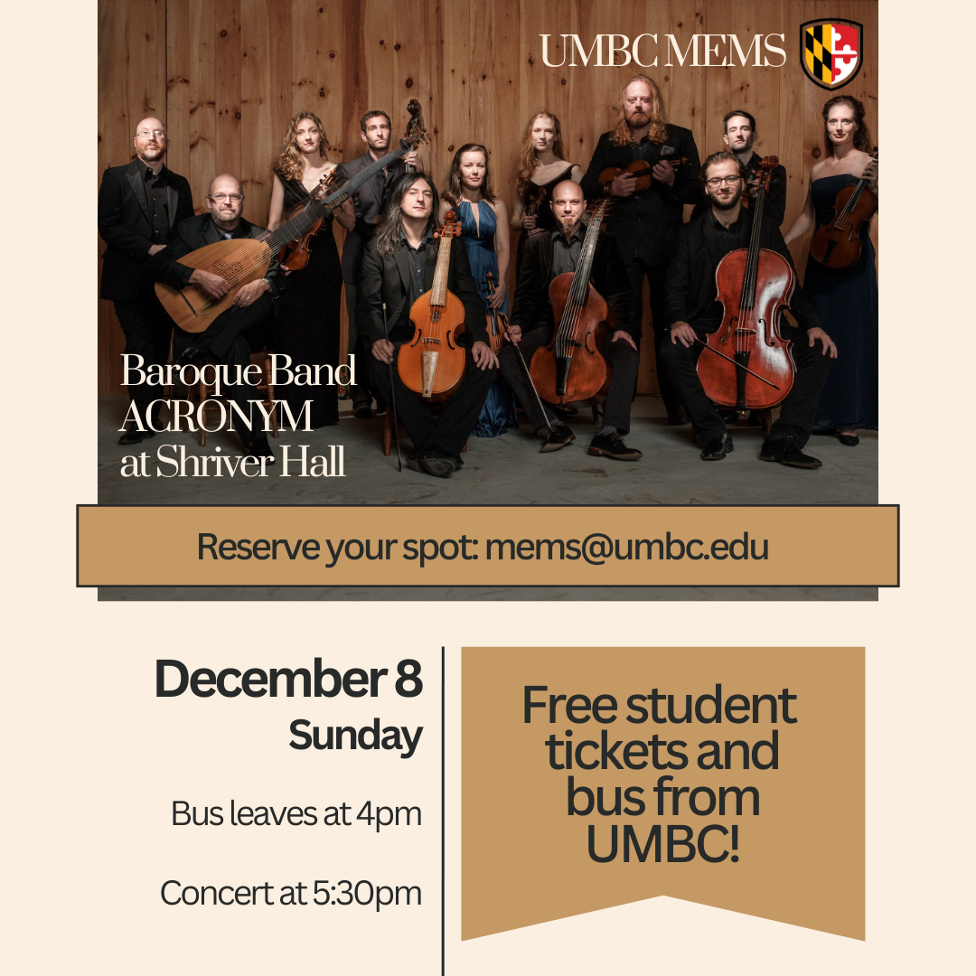 On Sunday, December 8, Baroque band ACRONYM will be performing at Shriver Hall. MEMS has secured a block of free student tickets and reserved one of the CAHSS buses to transport students from UMBC to the concert. This is a fantastic opportunity to see an exciting group! Tickets are limited and first come, first served. Email Dr. Lindsay Johnson at lmjohnson@umbc.edu to reserve a student ticket and indicate if you plan to take the bus.